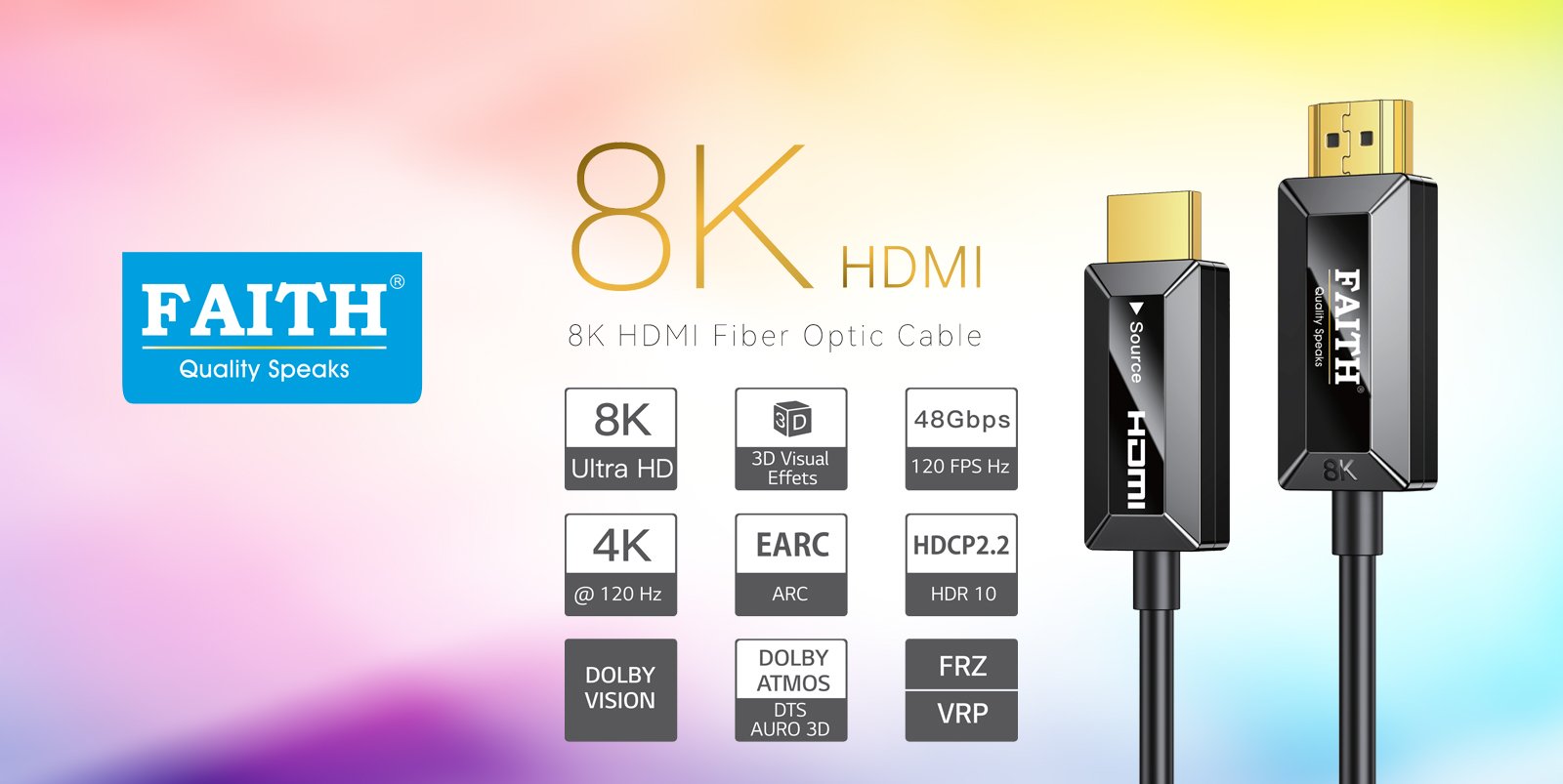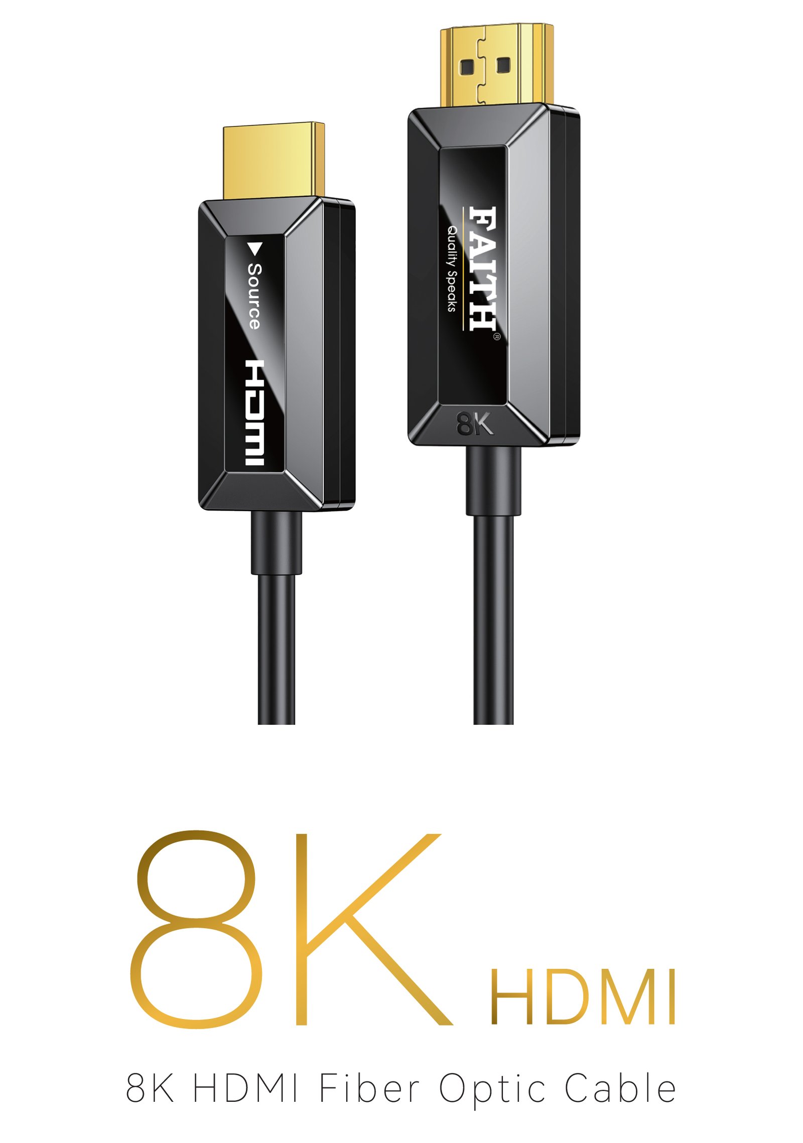 We, FAITH HDMI Optical Fiber Digital Cable is cable is designed for devices with HDMI ports, such as monitors, projectors, TVs, game consoles, etc. supports resolutions up to 8K, transmission bandwidth up to 48Gbps, supports 8K@60Hz, 4K@120Hz, 2K@144Hz; supports high quality HDR video with rich color detail and smooth, natural transitions; supports Automatic Low Latency Mode (ALLM) for smooth, lag-free, uninterrupted viewing and interaction. Support for Variable Refresh Rate (VRR) prevents tearing or lagging of images with high speed motion, ensuring smoother and more complete gaming graphics; support for Enhanced Audio Return Channel (eARC) function and Dolby Atmos support. With HDMI technology, 8K TVs deliver a clearer picture, richer colours and better audiovisual effects, bringing an unparalleled and stunning audio and video experience, creating a professional-grade home theatre for you.